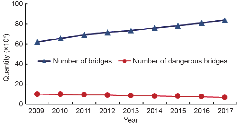 圖2. 近年來中國橋梁總數(shù)(藍(lán)色)及危橋總數(shù)(紅色)發(fā)展現(xiàn)狀